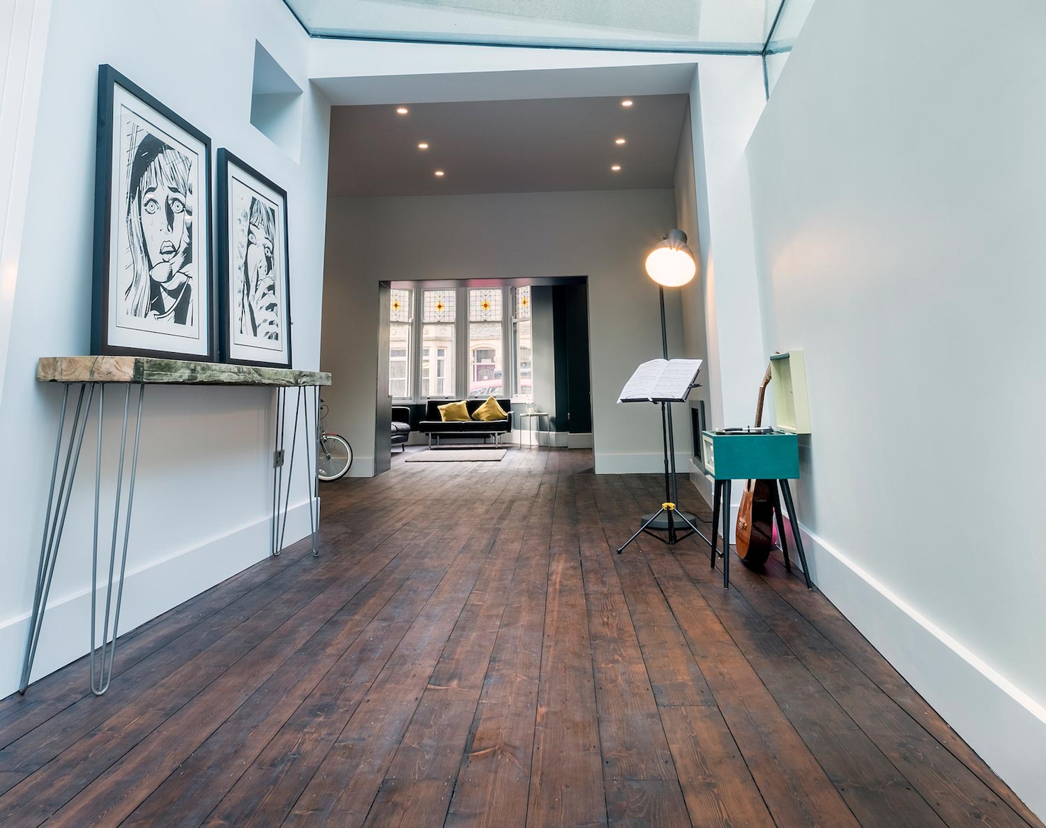 Working closely with the Structural Engineer, many of the load bearing walls were demolished, allowing for an open plan interior, whilst allowing a flood of natural light into the core of the house. The more recent addition of a double height flat roof extension was removed and replaced with a 9m long structural glass roof which had to be made in Germany and craned into position.