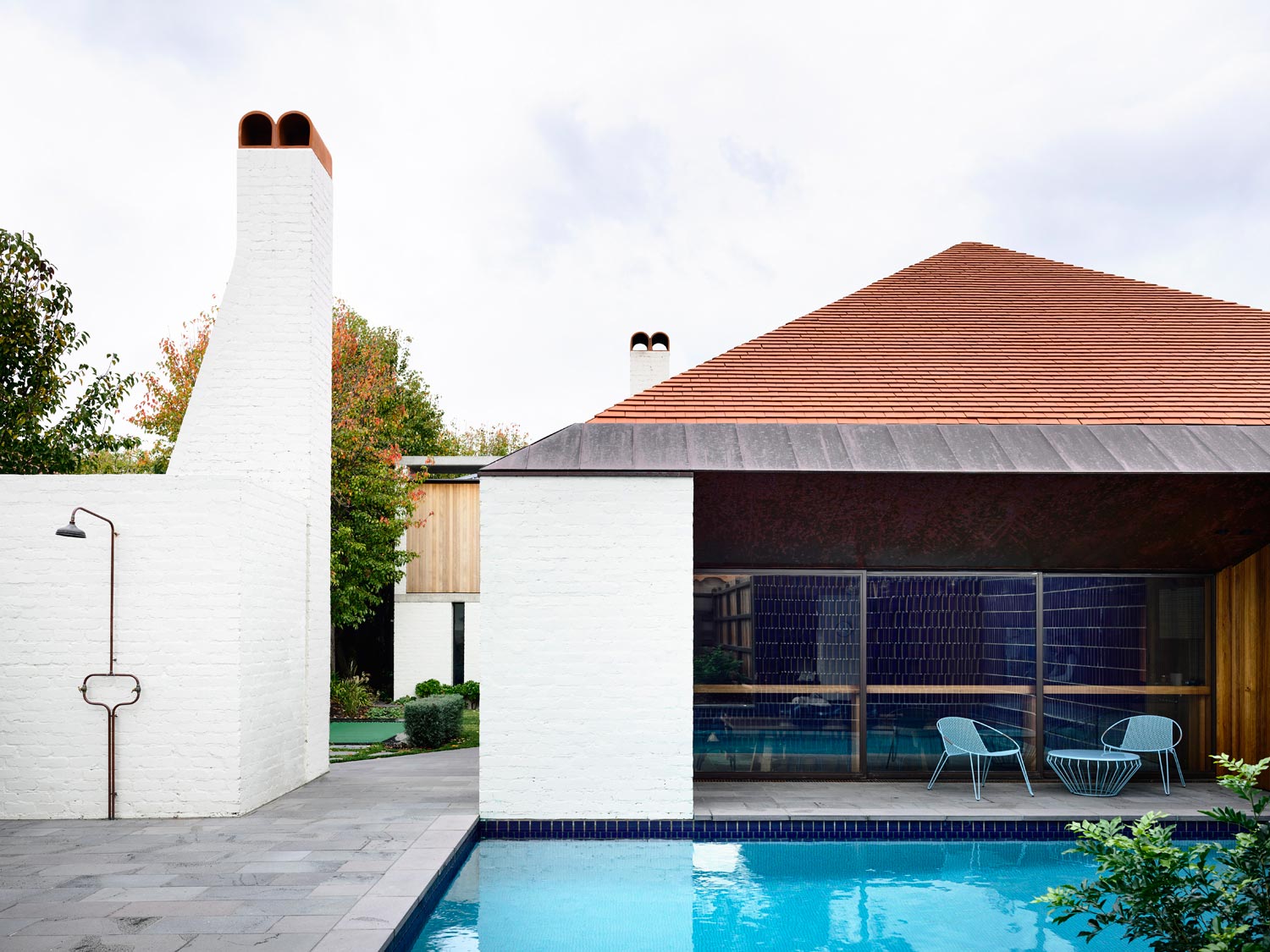 There is also whimsy, joy and beauty in this house: the formally expressive chimneys with their hand made pots, the fragrant cedar lined pyramid of the main living area, the heft and shadow of the brick and concrete rear pavilion, the intense colour and texture of the interior surfaces โ all contribute to a house which is so much more than the sum of its parts.”