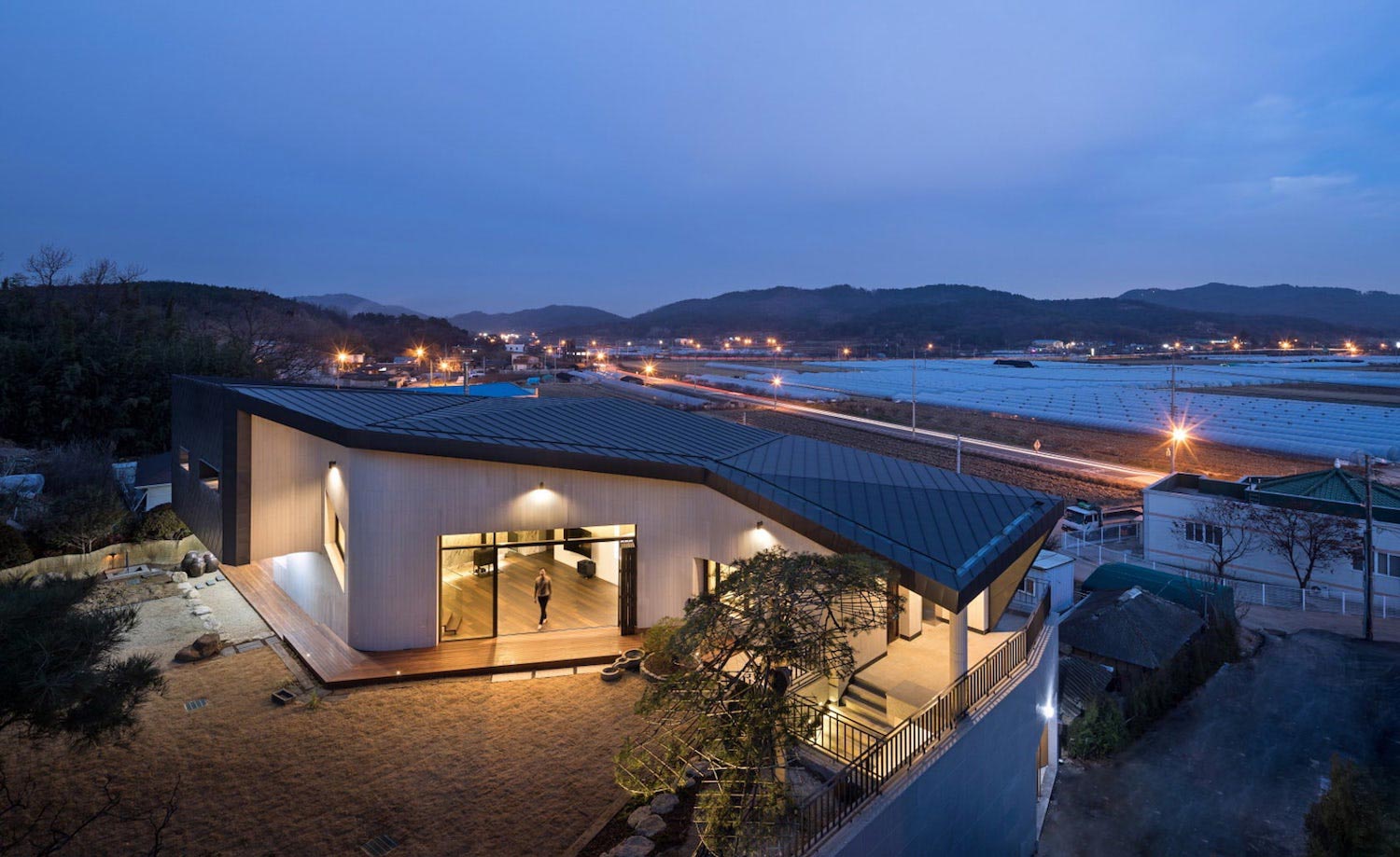 “A small town near Nakdong River is a place where the client spent his youth. He wanted to come back to his hometown and spend rest of his life in his new house. The site was the deepest place in town and a good place to overlook the town. There was a limitation of using site due to planned future road on the back of bamboo woods. To maximize green space, the house was placed following the shape of the boundary on the town side. The overall shape of the house is ascending from the entrance to the upper floor like a ridge.