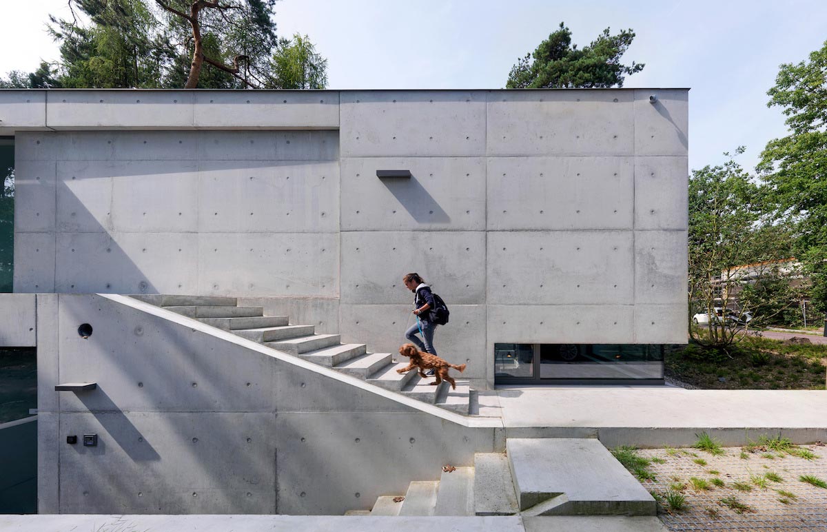 “The house is situated on the edge of a village in a natural setting where forest meets heathland. Distinctive features of the house are the raised patio and living area, the large overhanging roofs and the generous picture windows. The house is finished inside and out in exposed concrete. The straight lines and subdued detailing go to make up a striking design by Bedaux de Brouwer Architects.