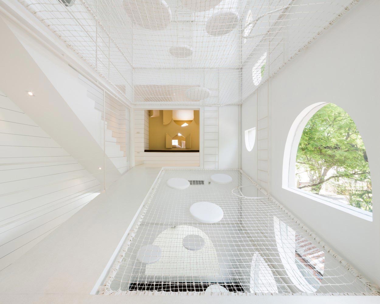 Central to Onionโs concern is the linkage of passageways. Onion adds an extra set of vertical circulations at the central hallway to the existing staircases and ramps. This space is now called the โmain living hallโ. Onion uses the customised nets to build five layers of horizontal planes of different slopes, heights and sizes. They act almost like the extension of floors within this three-storey high living hall. Each layer of nets has a hole and each hole is set in different locations. Children and adults can climb up the metal ladders from the ground floor to one of the sonโs bedrooms on the third floor. Jumping out of bed and falling down the holes here are safe because the players will be protected by the lower layers of nets. Hanging on to the nets is another technique of playing. The players can grasp parts of the nets that are slanting down to fit their heights. When looking upward, the mirrored film attached to the ceiling gives the illusions that the players are floating in the air and that the overlapping layers of net are higher than they actually are.
